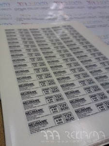 Výroba samolepek, nálepek na transparentní – průhledné fólii. Značení spotřebních výrobků a strojů. Nálepky / samolepky s různým typem adhezního lepidla.