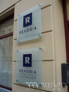 Výroba firemní tabule, štítu na skleněném podkladu a nerezové distance.